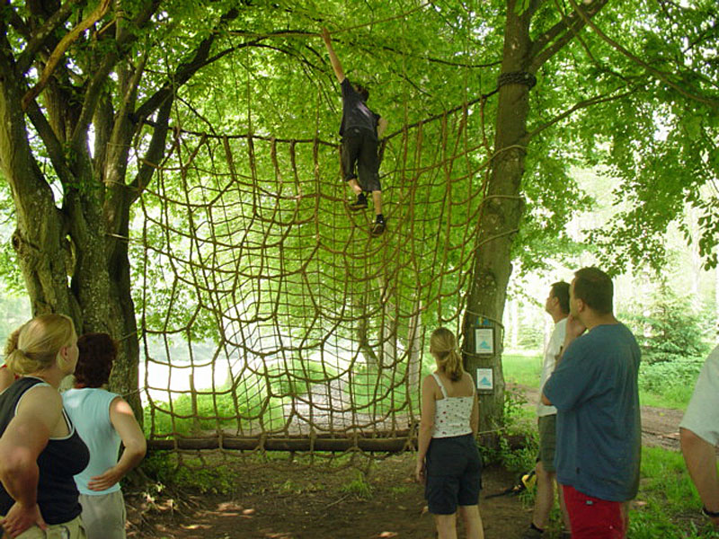 Een survival parcours dwars door de bossen langs en over touwbruggen en touwbanen over land en water. Onderweg kom je verschillende hindernissen tegen; een klimnet, een evenwichtsbalk over een klein stroompje naar een eiland, een lussenbrug, een catcrawl en een indianenbrug over het water. Klauteren langs de hoge oever van de rivier en de Amblève een aantal keren oversteken met behulp van verschillende touwbruggen en als klap op de vuurpijl: afglijden langs de spectaculair hoge tokkel, welke onlangs met 3 meter verhoogd is. Een sportief Adventure parcours.